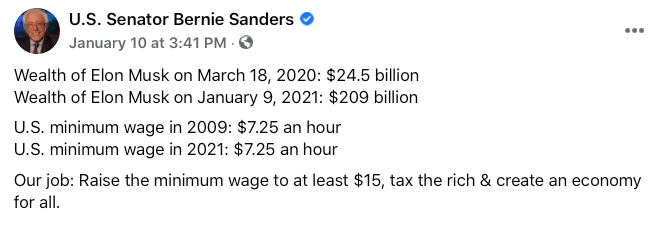 Among those expressing their frustration was Bernie Sanders who showed how within less than a year, Musk had grown his wealth from $24.5 billion to $209 billion—a truly staggering increase. He then compared that increase to the stagnant US minimum wage. Now whatever your thoughts on the minimum wage and its usefulness as an indicator of income inequality, we can take the core message here: in this economy the rich get richer while everyone else faces wage stagnation and limited upward mobility. We could point to a few examples of this being the case. We could show that real wages have stayed mostly the same for decades and that the income gap is indeed widening, but I want to focus on the problem with the way these issues are being presented in this particular instance.